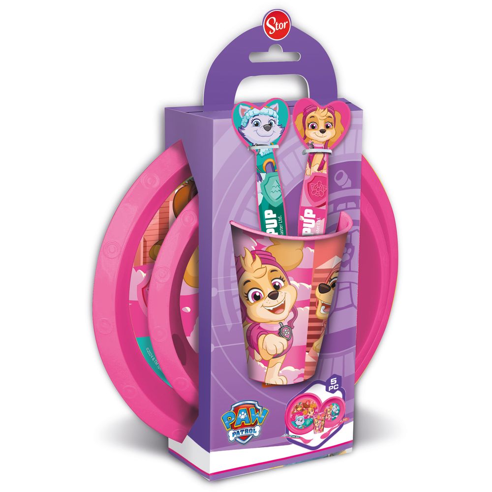 Este combo escolar contiene 5 elementos esenciales: botella, vaso, lunchera, cubiertos y estuche, todo decorado con Skye de Paw Patrol. Presentación en caja ideal para regalo. Todo el set es libre de BPA, pensado para la comodidad y seguridad de los chicos.