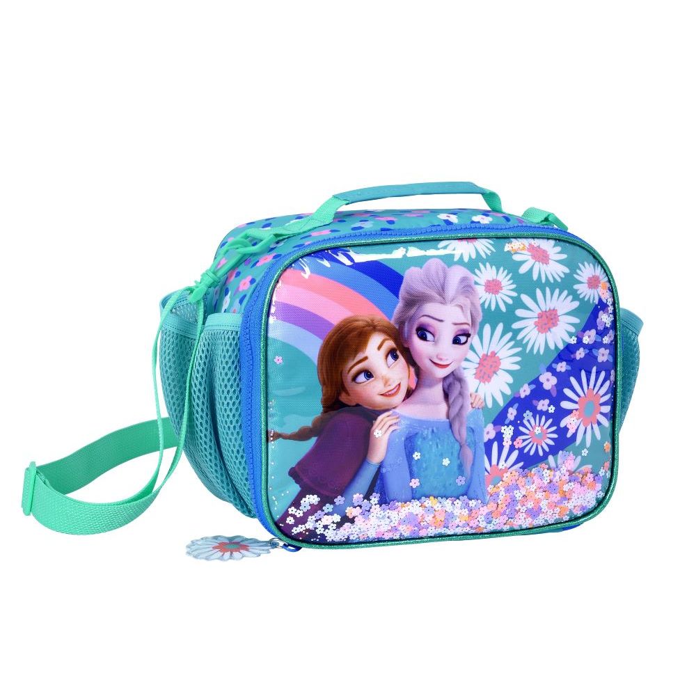 Lunchera Térmica Frozen Flowers. Conserva la temperatura de la merienda. Características Clave: Interior con aislante térmico y forro. Práctica manija de transporte y correa ajustable.