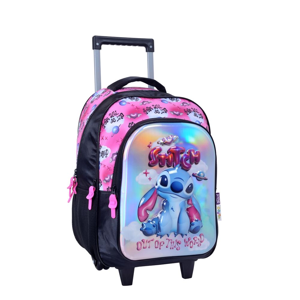 Mochila Carro 3D Stitch 17" (Celeste / Negro). La versión con carro del diseño 3D. Características: Tamaño 17 pulgadas. Diseño frontal en relieve 3D de Stitch. Carro con ruedas y manija extensible. Ideal para evitar el peso.