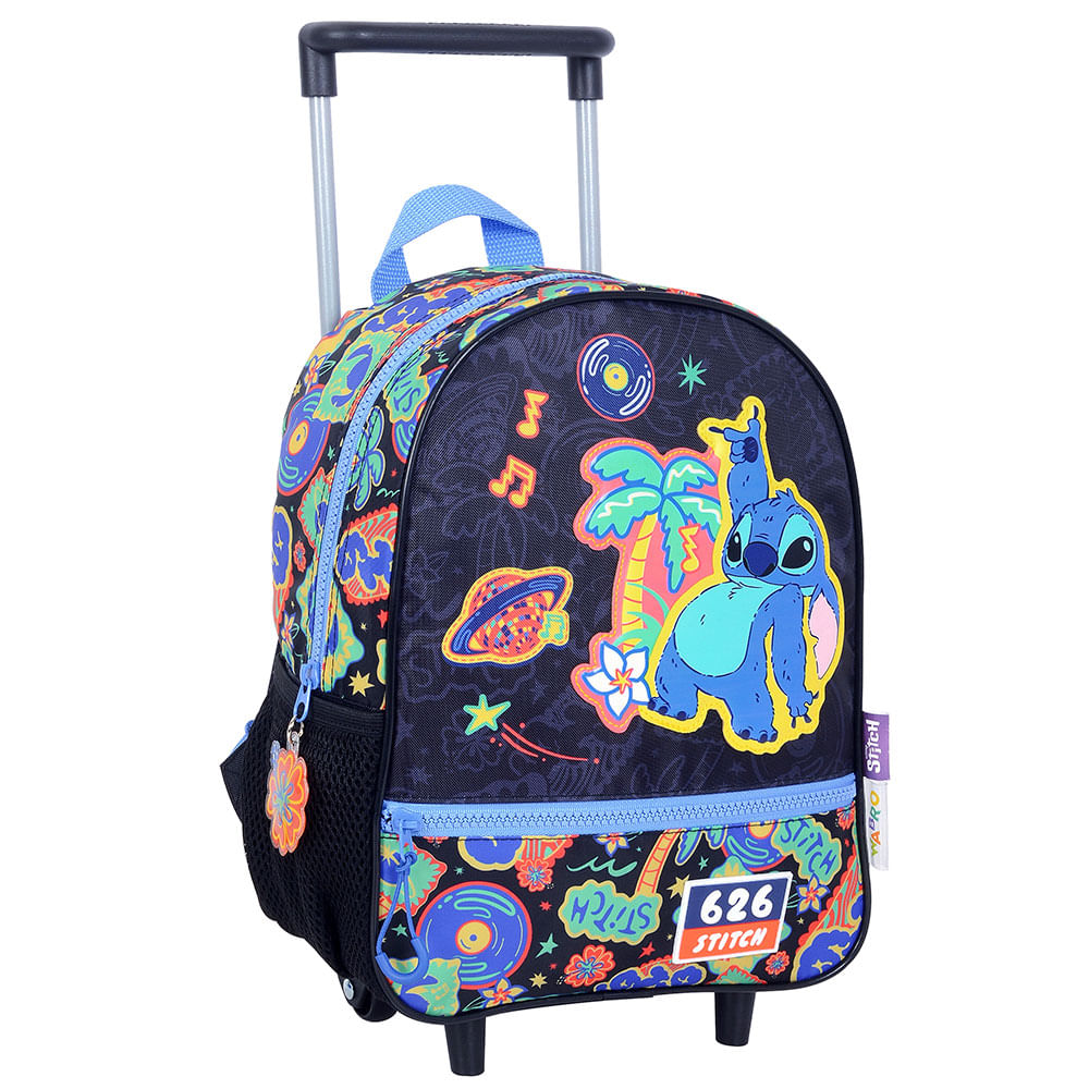 Mochila Carro Disco Stitch 12" (Azul / Negra). Diseño de carro para los más pequeños. Características: Tamaño 12 pulgadas. Sistema de carro con manija extensible. Ruedas. Ideal para evitar cargar peso en la espalda. Medidas Aprox.: 30 x 22 x 10 cm.